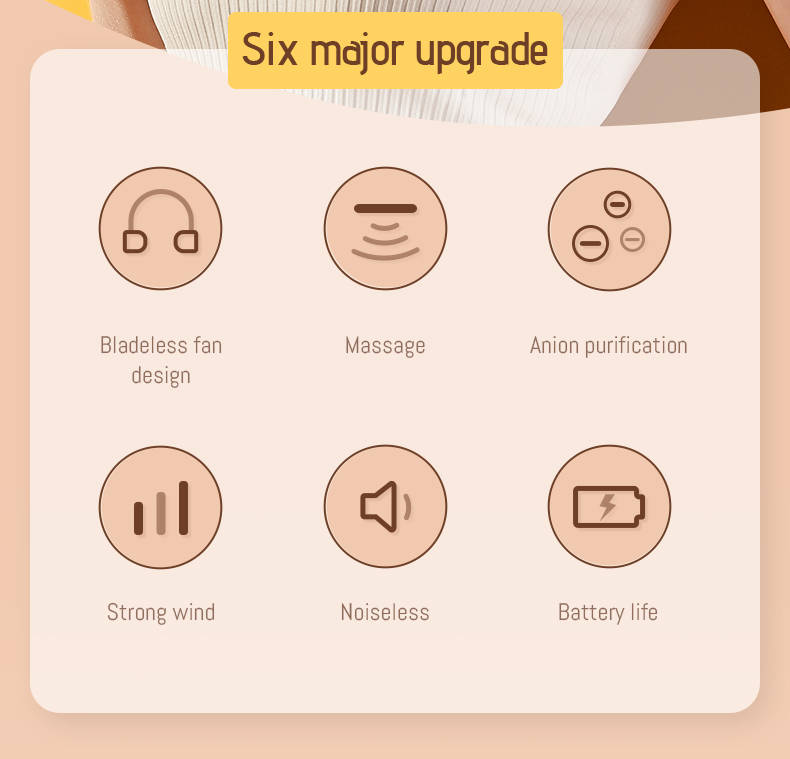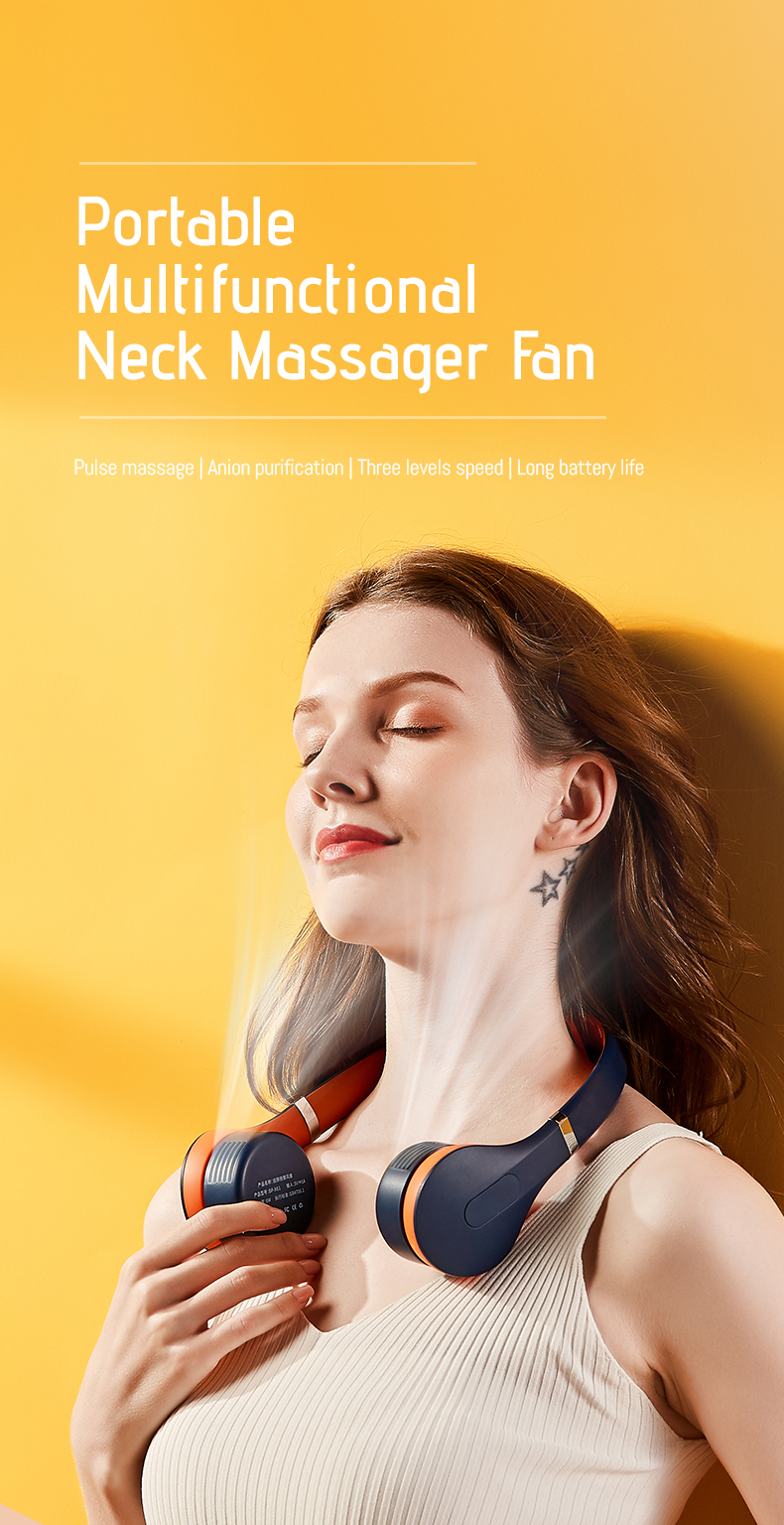 - Bladeless and Noiseless Turbo Cooling Fan + Neck Massager with Heat +Anion purification+Polymer explosion-proof battery+Long battery life + Light Weight and Wearable easy and comfortable.