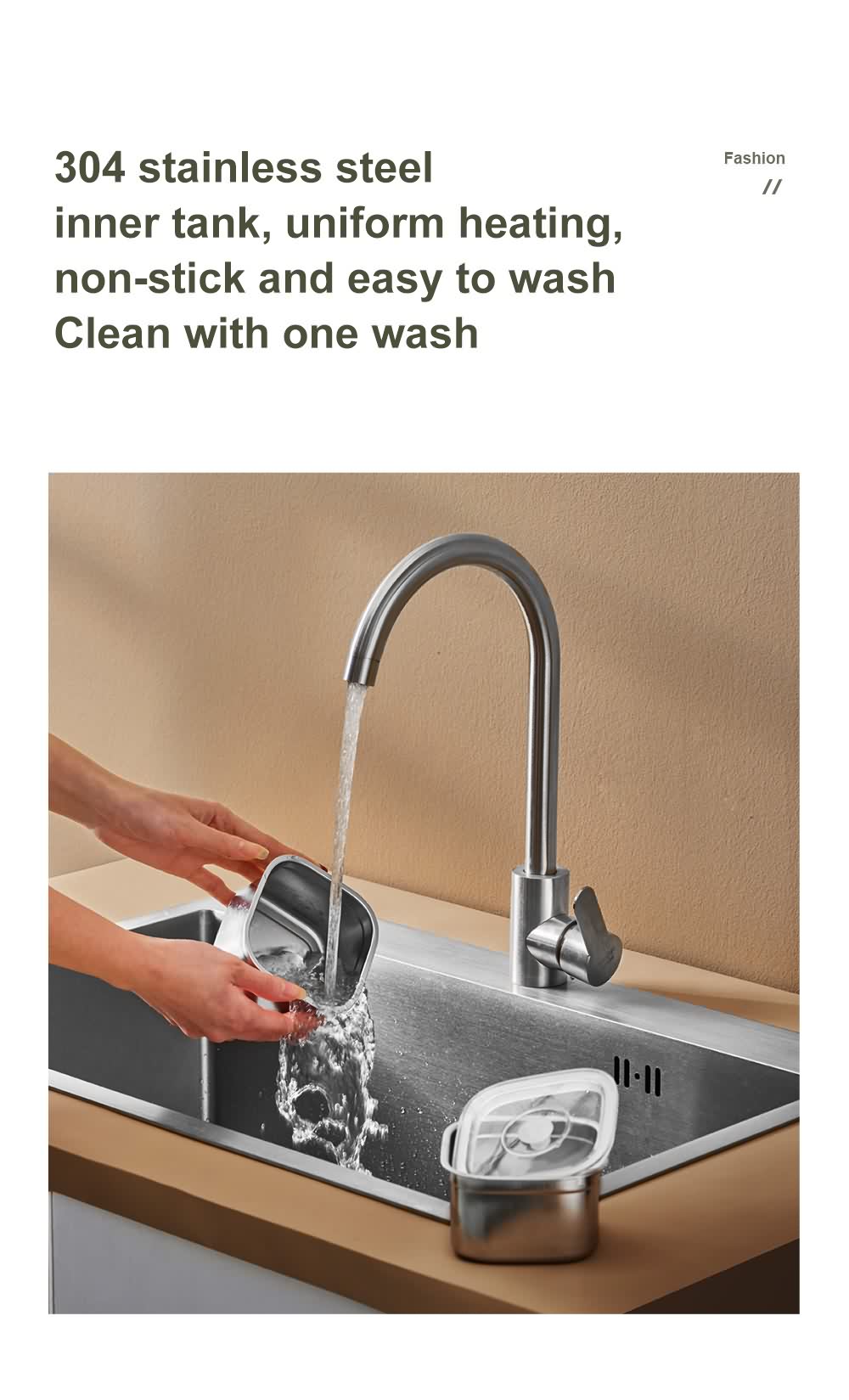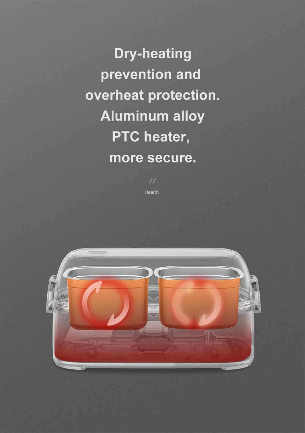 Using steam circulation heating, built-in constant temperature PTC material, heating is very uniform, the food is cooked thoroughly without being mixed, and it will not lose water like a microwave oven, and it is more power-saving!