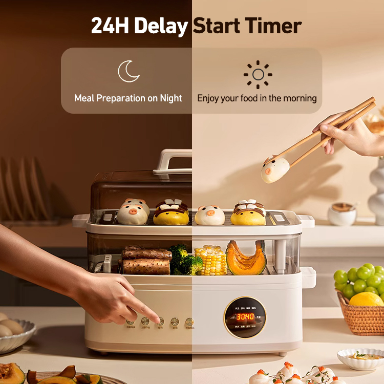 MAK veggie steamer has a 24H delay start function, which is designed for your flexible meal planning. Prepare the ingredients in advance and preset the delay start time you want to serve, then you can enjoy a hot meal when you get home. The electric steamer will automatically switch to keep warm after the cooking process completed. It ensures the food remains warm and fresh, without the need for reheating.