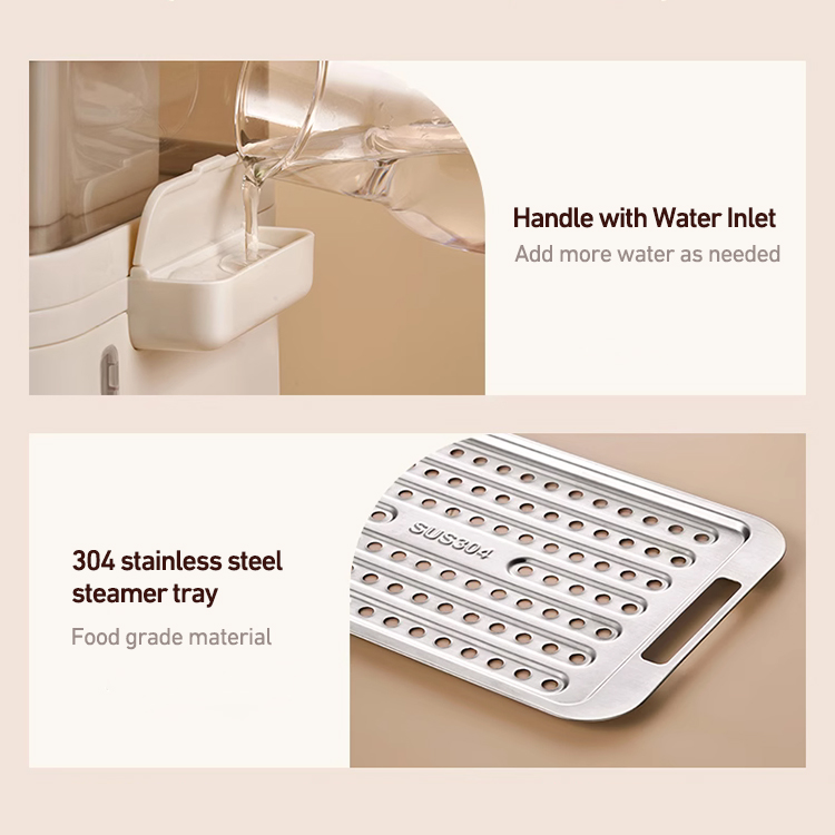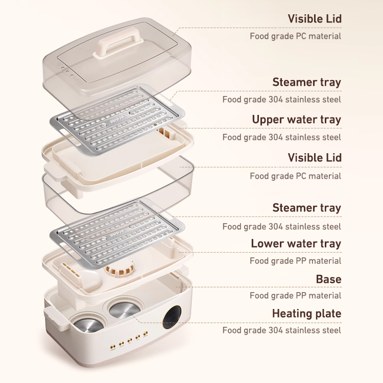 With its powerful 2000-watt heating element, Veroline vegetable steamer creates a steam cycle on the base that accumulates heat rapidly, producing steam in only 8 seconds. The food is heated evenly and the nutrients are better retained. At the same time, the electric steamer has over-heating protection and boil dry protection, making it safe to use.