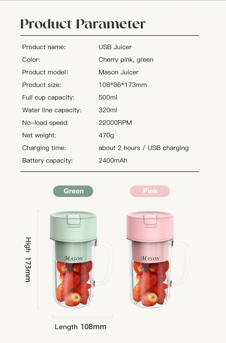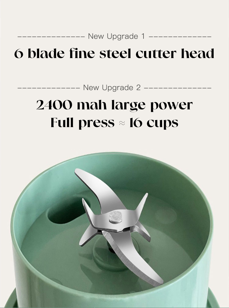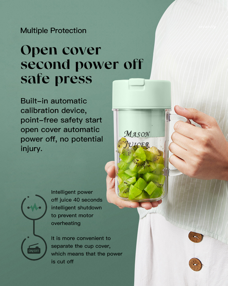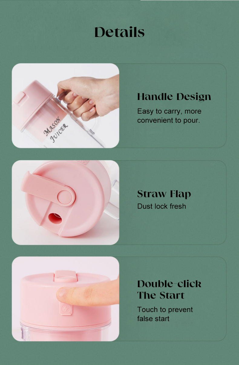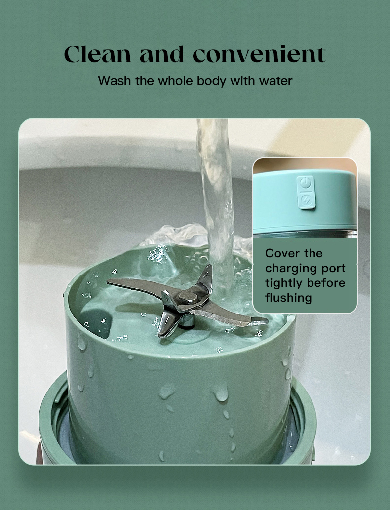 Cordless and portable, more user-friendly design, USB charging, 1400mAh lithium battery capacity, in the fully charged state, the shake blender can be continuous working 5-10 times. Simple operation, just adds the fruit and water in and double-click the switch. Even for beginners is also friendly, please make sure that the lid is fully tightened before use.