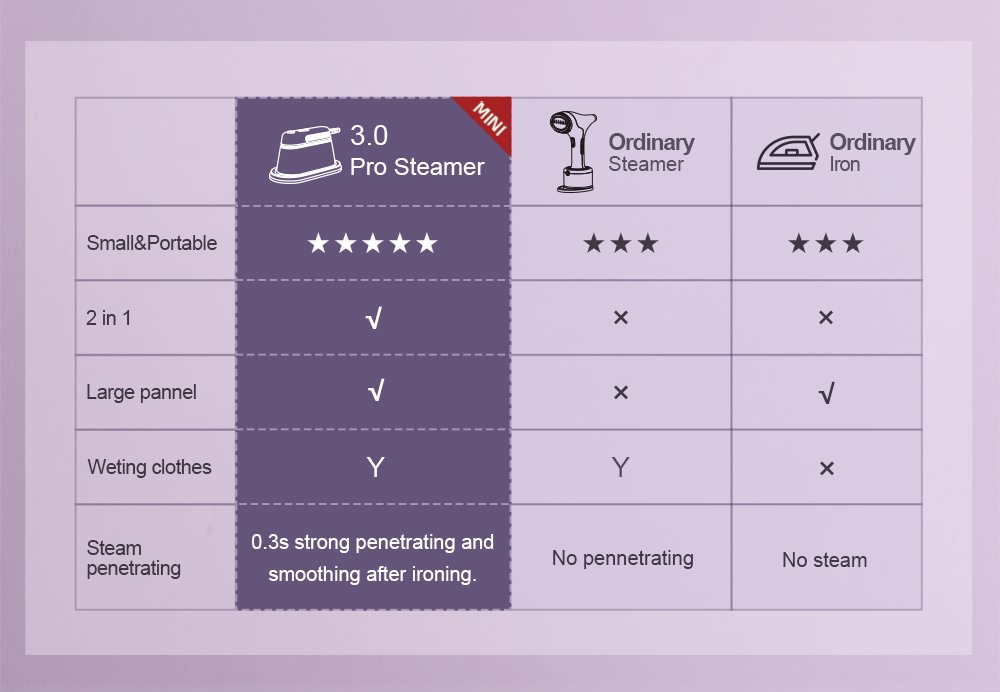 0.3s strong penetrating and smoothing after ironing. Be a business conference or a leisure trip, this portable iron has got you covered!
