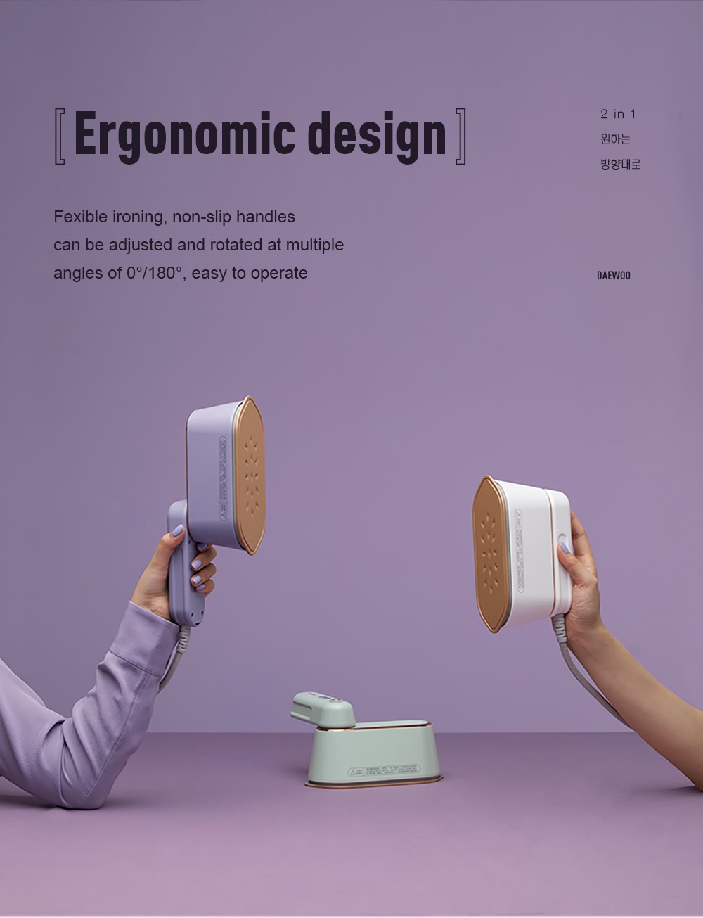 Various handles, flexible ironing, non-slip handles can be adjusted and rotated at multiple angles of 0°/180°, easy to operate.Unlike the cumbersome corded conventional irons, this portable travel iron can smooth out hard-to-reach areas close to the seam, collar, cuffs and buttonholes with ease. With this smart tool in hand, ironing impeccable-looking clothes has become effortless.