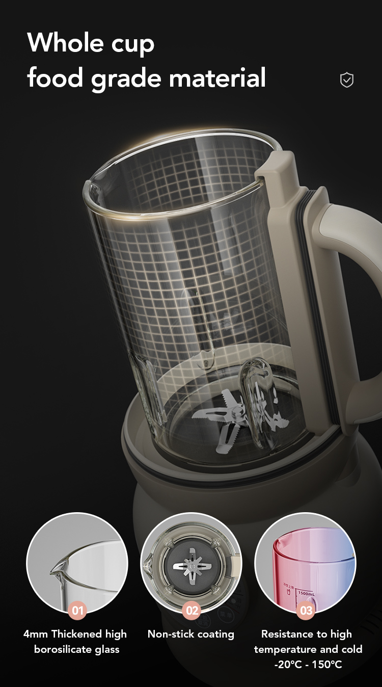 Material: Non-stick PTFE coating, SUS304 stainless steel blades, borosilicate glass.