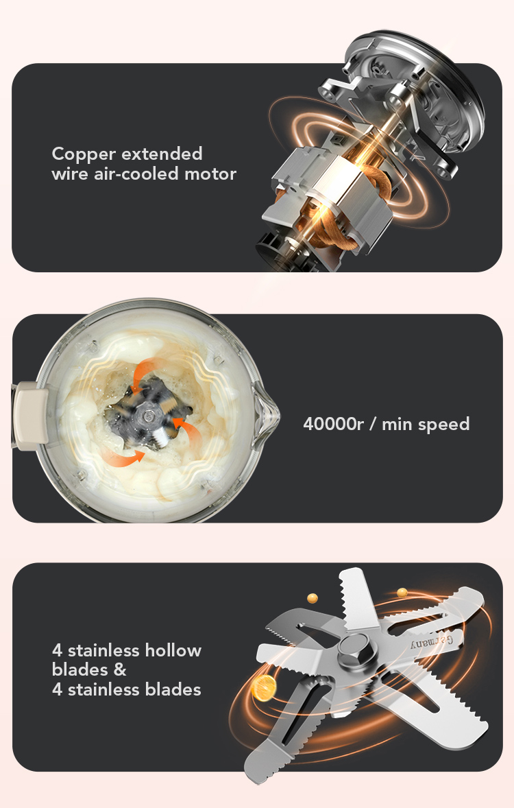 8 stainless blades,40000r/min copper air-cooled motor, makes it extra durable. Also with 11 different modes, make sure the texture of your shake is exactly what you would expect.