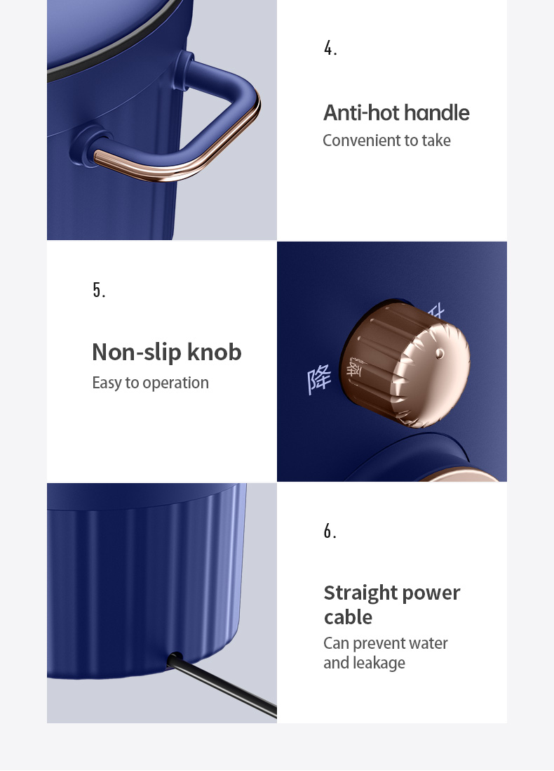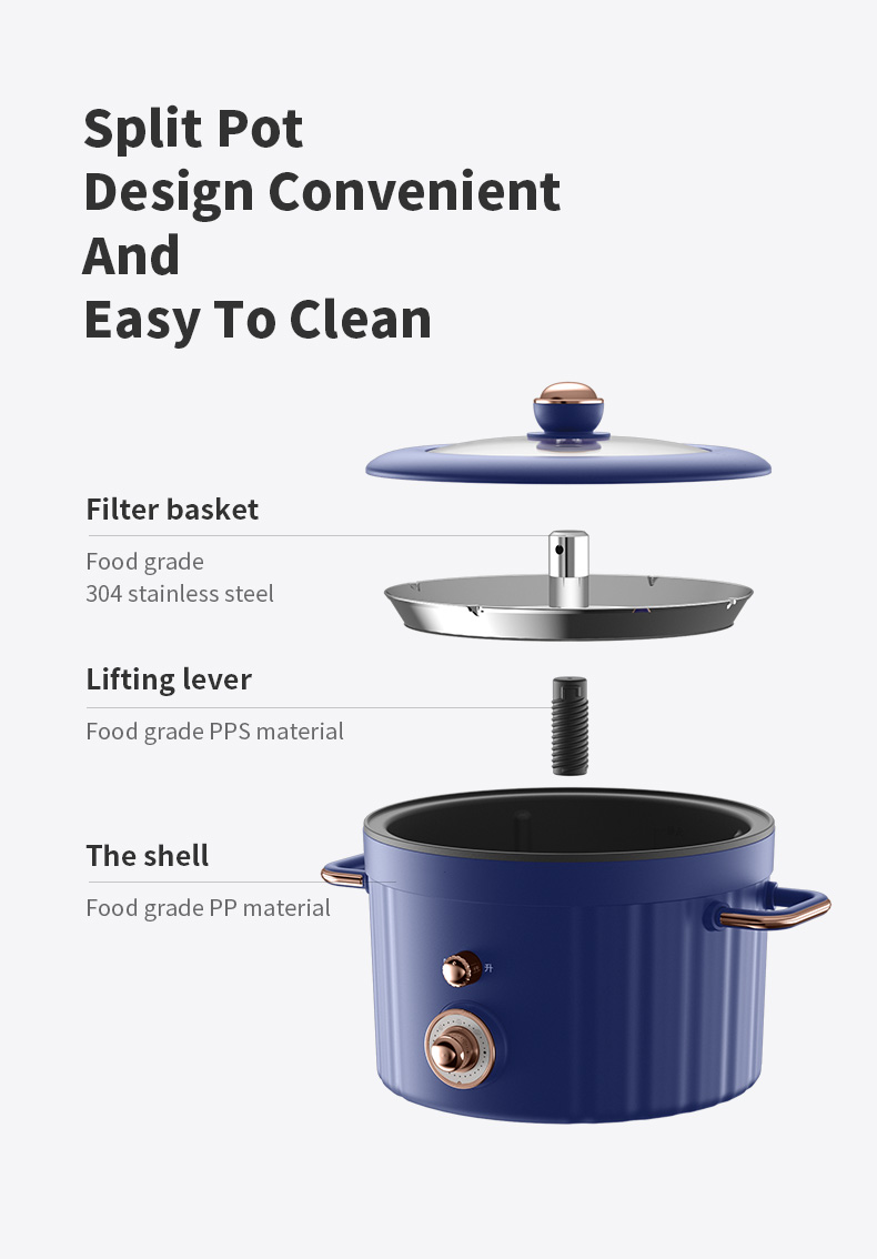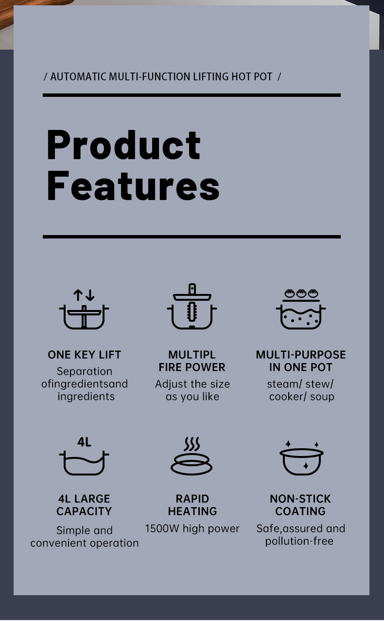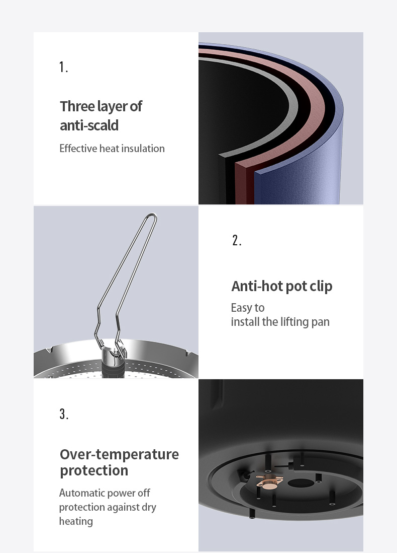 Unlike other electric pots, our Smart Hot Pot lifts automatically to de-sugar your rice and separate your meal from your soup. The side handle is a better design than center pillar cookers, it makes cleaning easy and with the anti-scald handle, burns are easily avoidable!