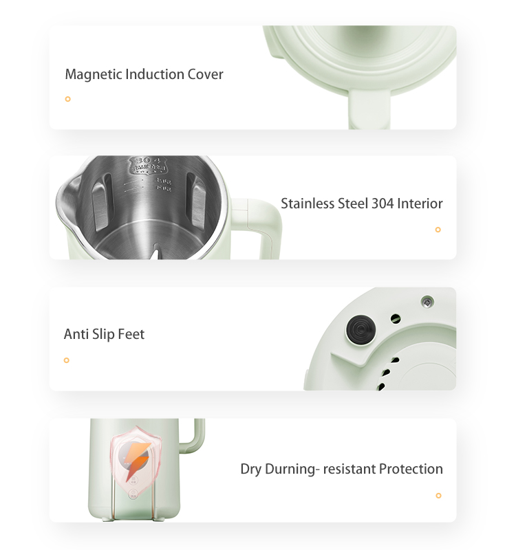 This soy milk machine adopts food grade 304 stainless steel liner to keep your health. And no need to open the cover, you can just dump milk directly, safe and anti-scalding. Meanwhile, it will automatic power off when the cover is opened.