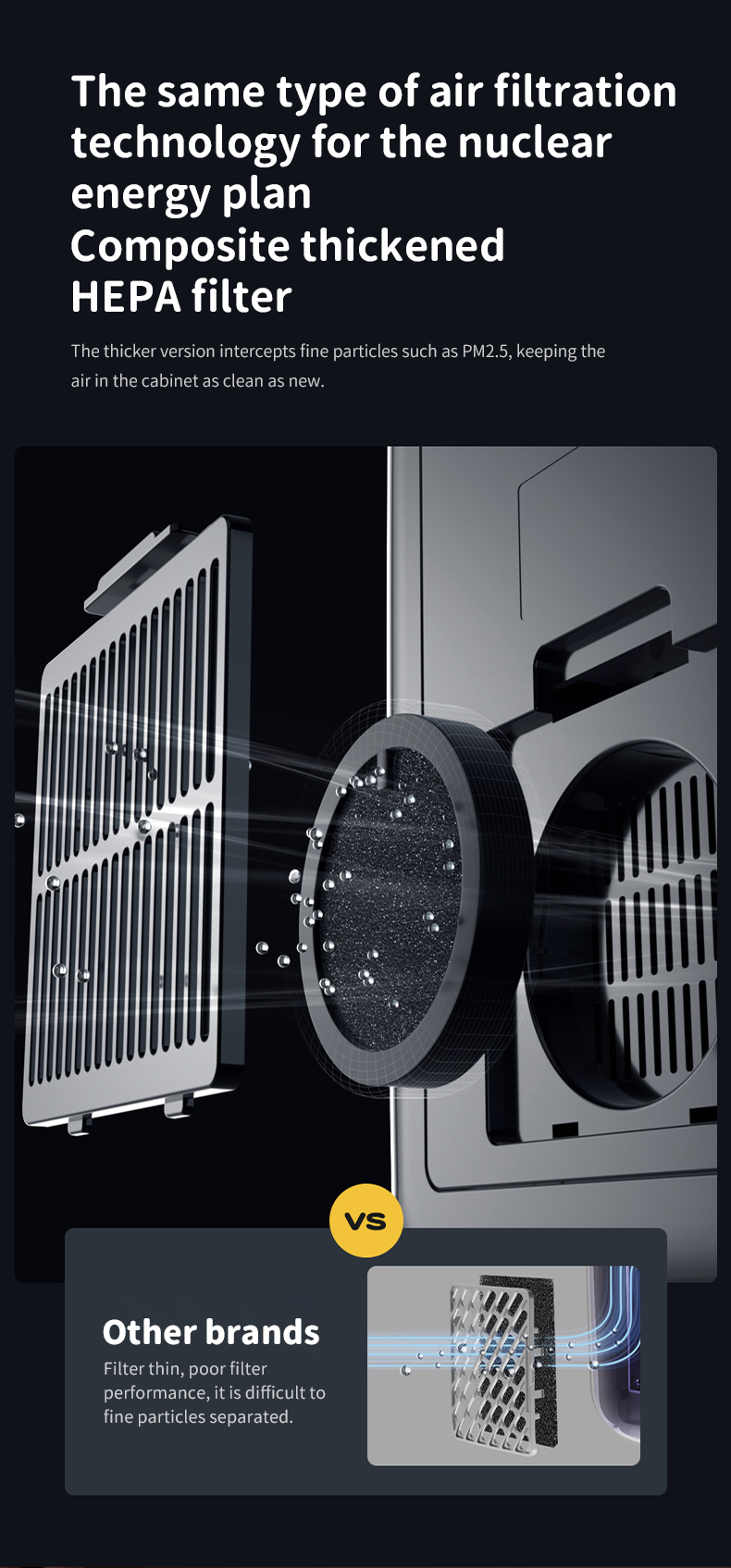 Made of 304 stainless steel and polypropylene plastic. The composite thickened HEPA filter isolates dust particles in the air to ensure that clean air enters without causing secondary pollution.