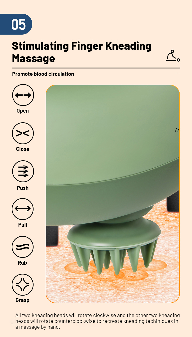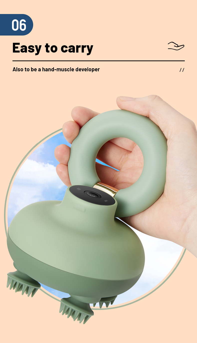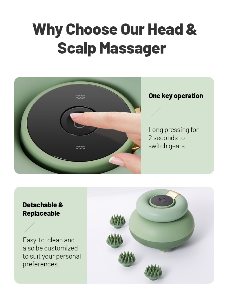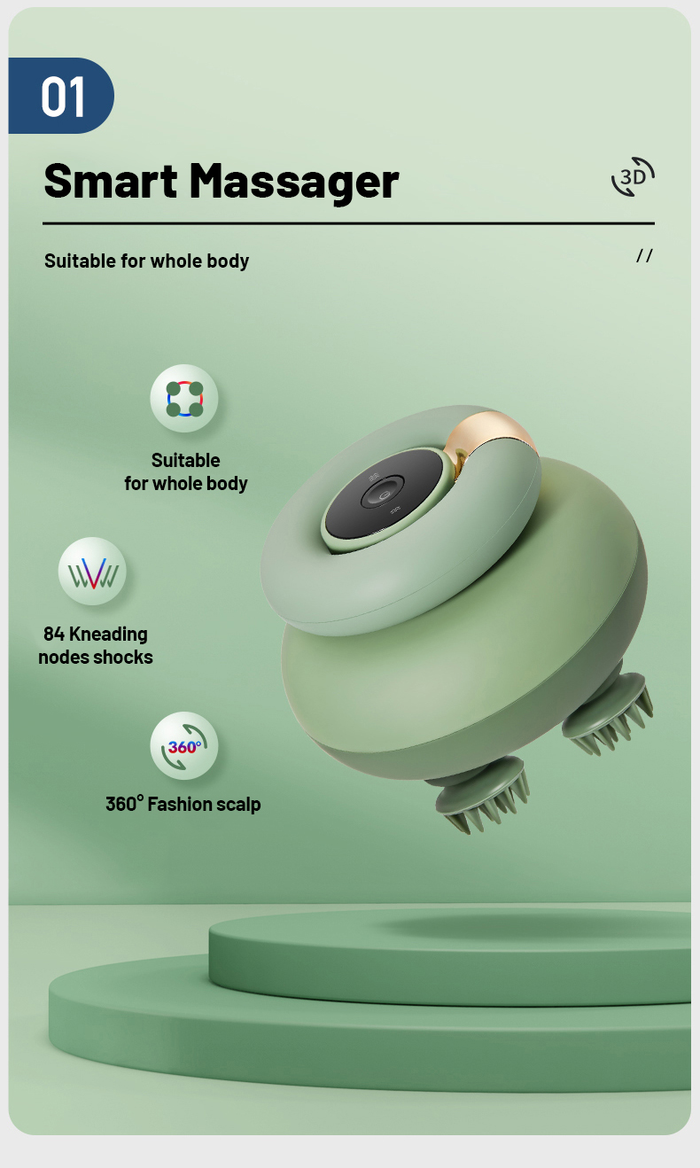 Our scalp massager features 4 massage heads with 84 individual nodes that are designed to fit the scalp and gently provide a 360°kneading massage experience to promote inner scalp circulation and relieve stress.