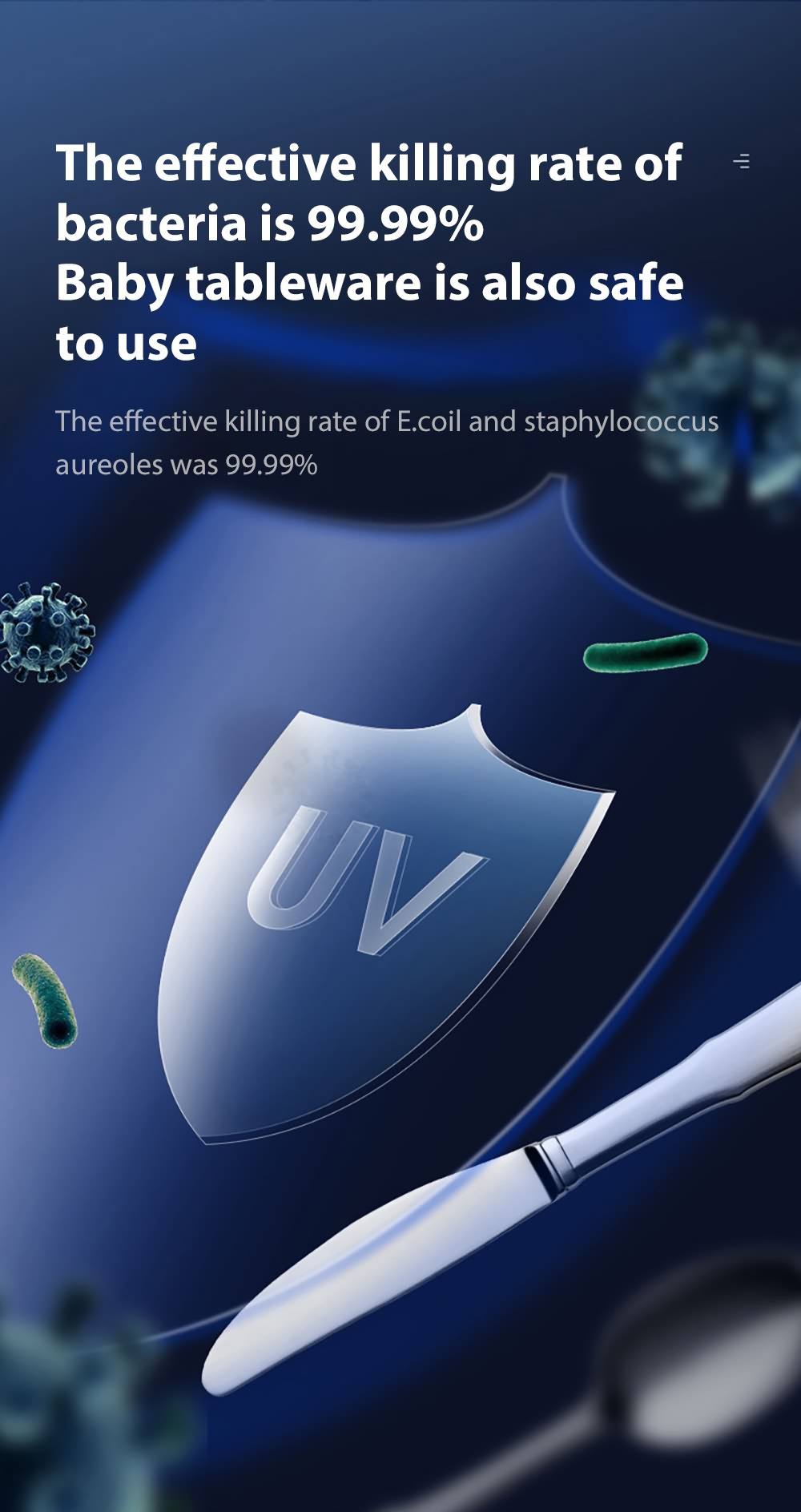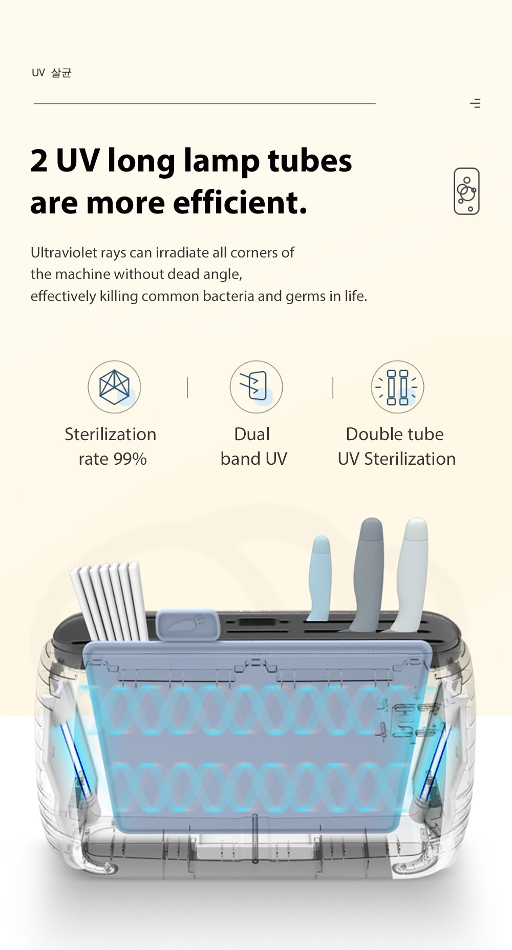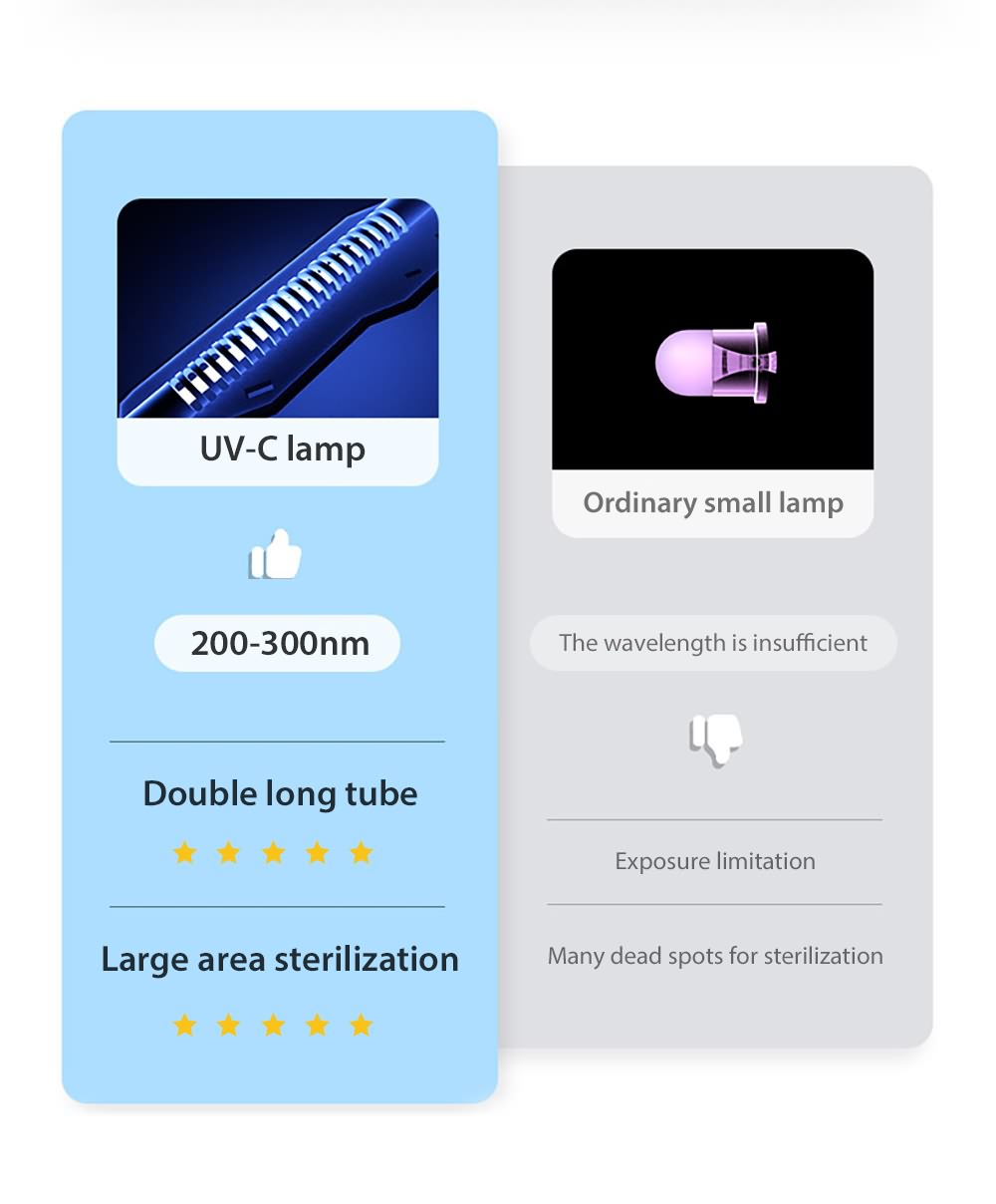 Double ultraviolet lamp sterilization, can irradiate all corners of the machine without dead angle, sterilization rate reach 99%, effectively killing common bacteria and germs in life.