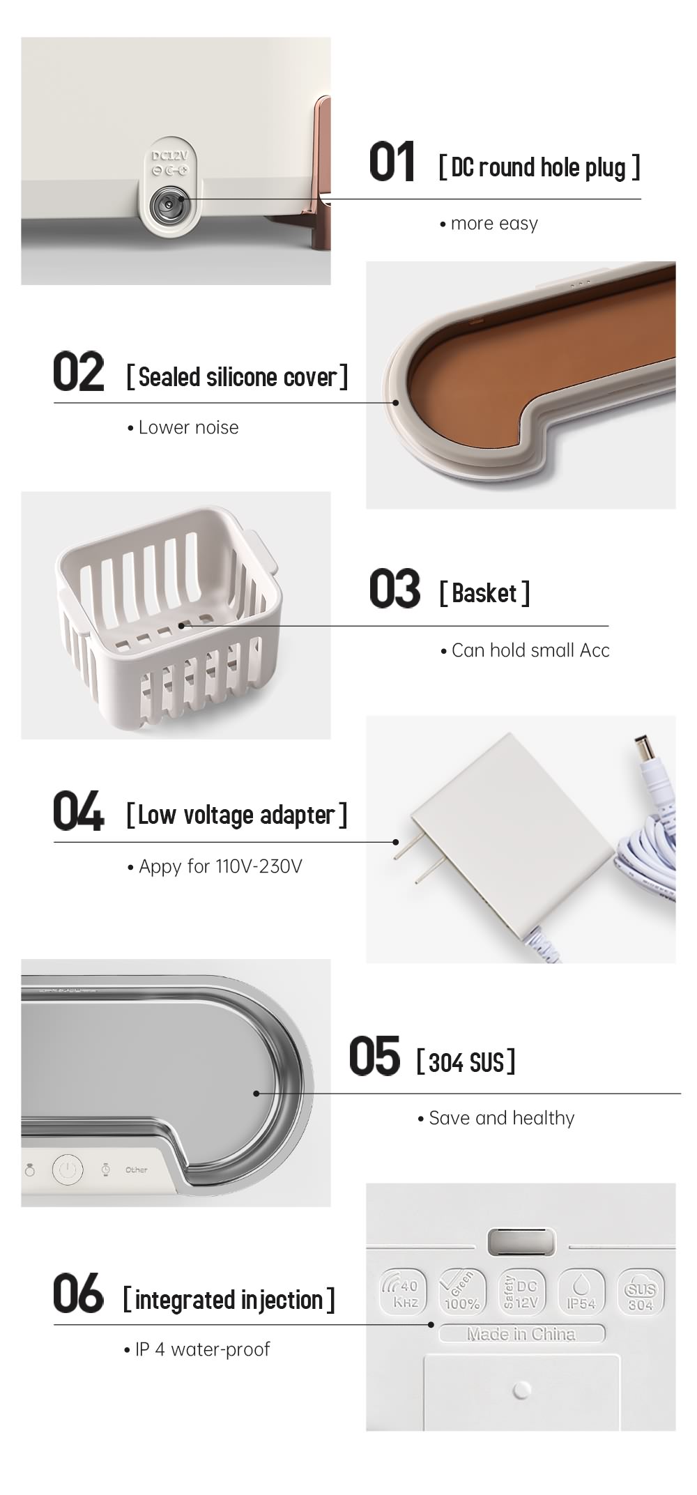 With a stainless steel tank and a generous capacity of 500ml , this jewelry cleaner can fit most of your jewelry and other valuables, from the smallest of your earrings, to your daily eyeglasses. The removable cleaning basket and watch holder that comes with this package helps you gather small items securely. Even with its large internal capacity, this machine is very easy to fill and has a double waterproofing process which makes it leak-proof during operation.