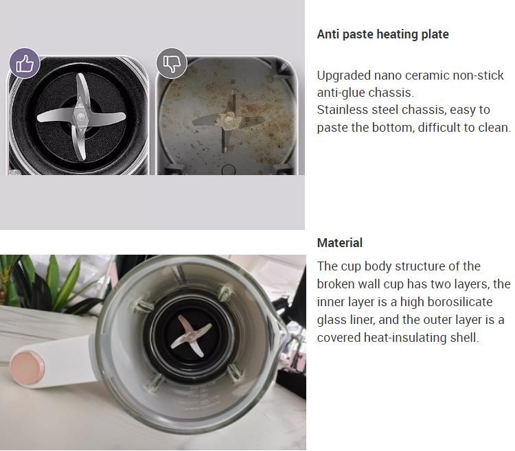 Big capacity ,800mL blending cup+100mL grinding cup +800ML kettle cup. The bottom four corners are installed with anti-skid silicone pad, stable without displacement, , reduce resonance. There is a cooling air duct at the bottom, and the raised foot pads ensure the circulation of air.