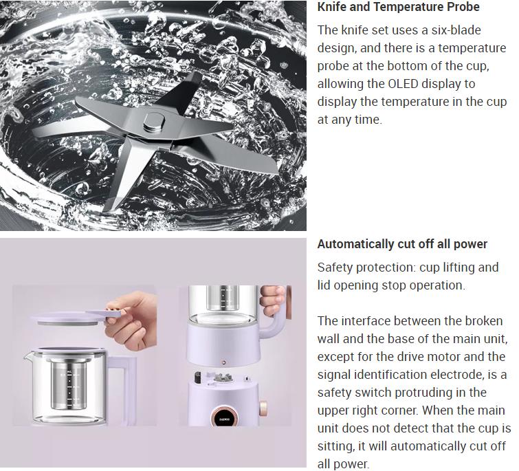 The built-in OLED screen can not only select recipes, but also display the heating process and temperature changes in real time.10 functions of blending cup + 10 functions of health cup+ 10 functions of grinding cup.